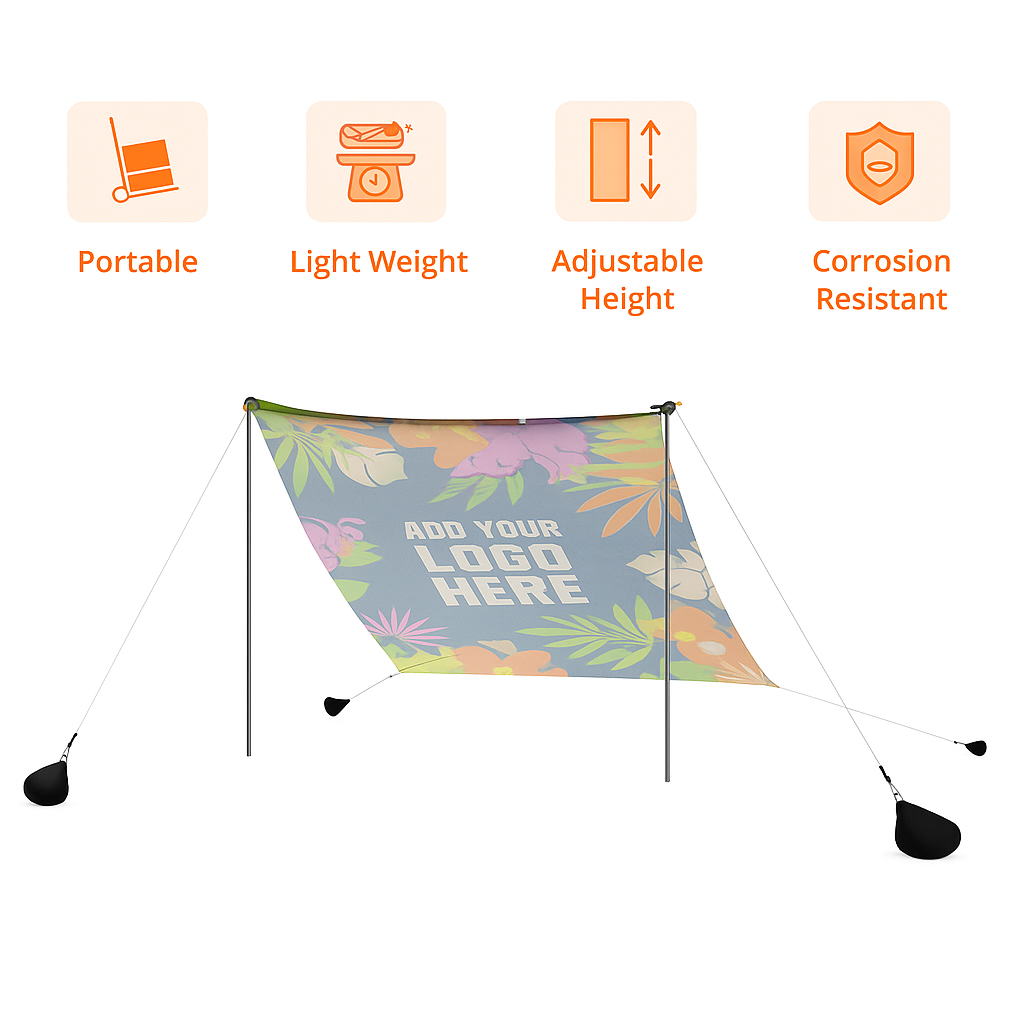 Our beach shade tent can be completely customised to suit your preferences. Available in various sizes to suit your unique needs. Easy to assemble with simple instructions and light materials, it stands firm even on windy days due to its elastic nature. Create a distinctive pop-up beach canopy by uploading your design on the design platform, or letting our expert designers craft something uniquely tailored to you.