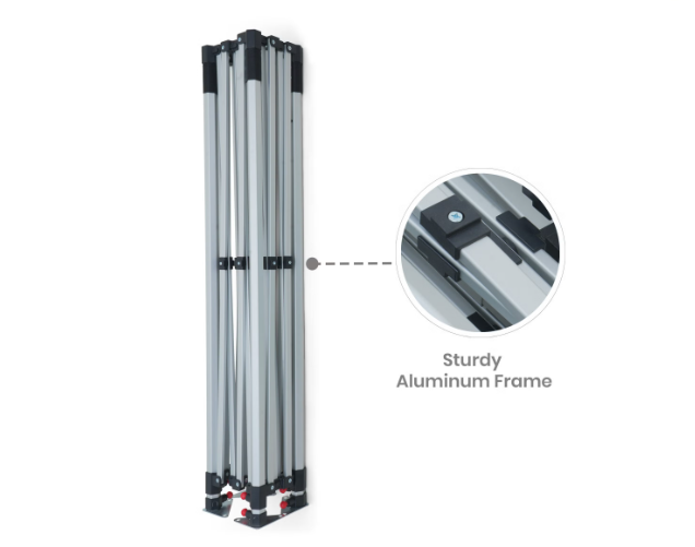Our canopy tents are constructed with top-tier materials that provide durability and effective performance. Choose from two types of fabric: the standard 600 denier acrylic-coated polyester or the GRS-certified sustainable polyester, both robust and designed for long-lasting use. With a graphic weight of 270 GSM, these materials ensure excellent resilience under various weather conditions. The aluminium frame features a pop-up design and telescopic legs for adjustable heights with a diameter of almost 40 mm, ensuring stability in different outdoor settings.
