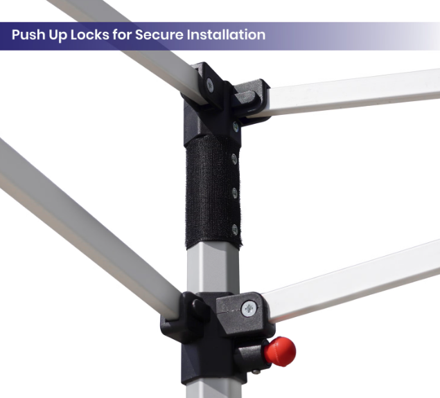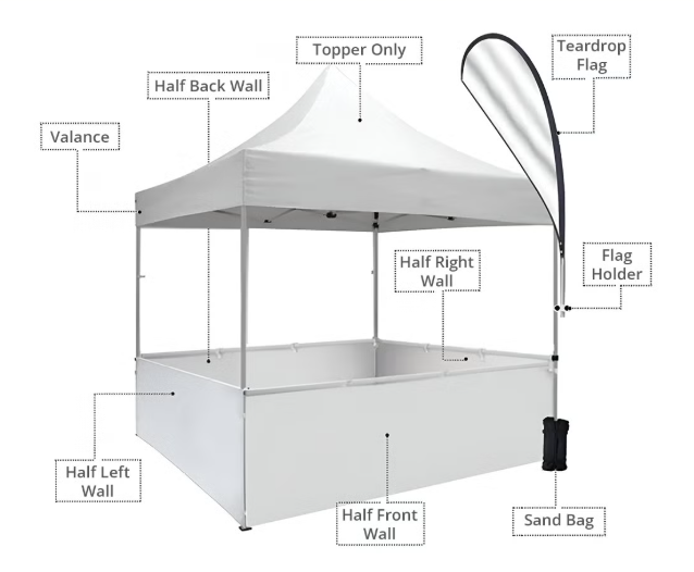 Lift the appeal of your tent with extensive customisation options. Personalise your pop up tent with logo with multiple choices for back, front, left, and right walls, effectively promoting your brand. Customise your pop up canopy tent to suit your preferences by selecting from our additional accessories, such as the flag holder with an optional teardrop flag for enhanced visibility. A specially designed topper attachment with self-securing closure on the valance’s inside edge makes adding accessories straightforward. Enhance stability with optional sand bags designed for secure tent anchoring in windy conditions.