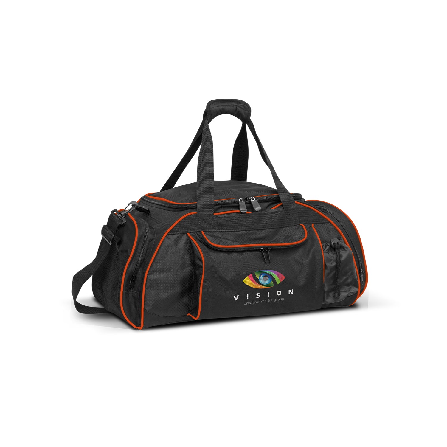 Contoured duffle bag which is manufactured from strong 600D polyester with attractive patterned ripstop polyester accents and distinctive coloured piping. It has woven carry handles with a Velcro cuff and a padded woven shoulder strap which is adjustable and removable. Horizon features three external zippered compartments, one of which is an extended water-resistant inner bag for shoes or wet clothing. Other features include an adjustable water bottle holder, a reinforced base with plastic feet and an outer mesh pocket.
