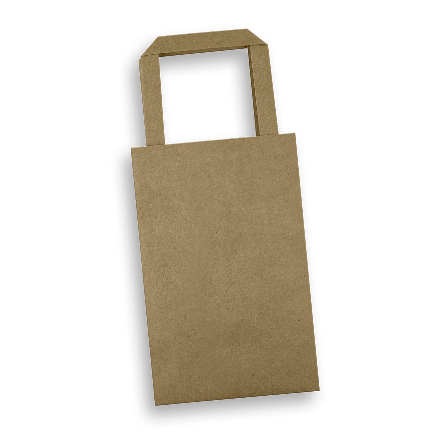 Small carry bag made from 180gsm paper with a reinforced base and square-folded 100gsm paper handles. This bag is portrait orientated with handles and gusset along the shorter edges.